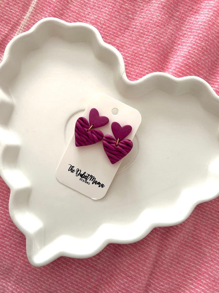 The Arielle earrings feature two purple hearts, one solid and one with a knit pattern. Lightweight and made with hypoallergenic ball posts for everyday comfort.