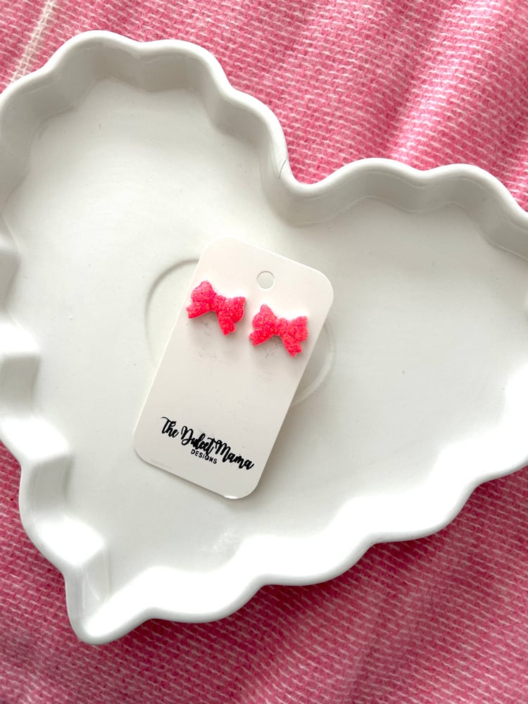 Hot pink glitter bow earrings, resin-coated and hypoallergenic- fun and perfect for everyday wear!