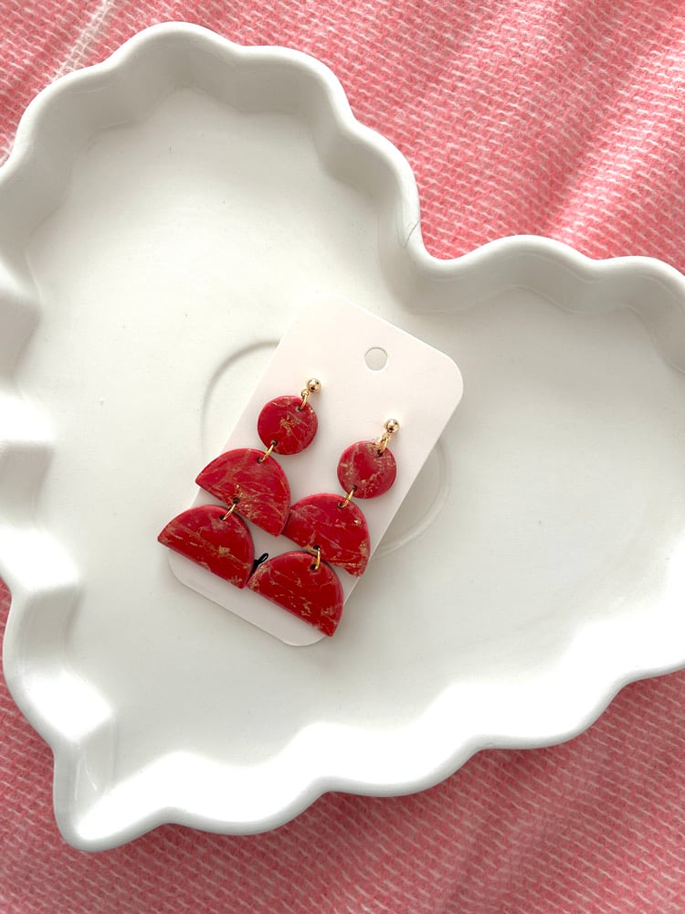 The Lucia earrings feature a red and gold clay design, finished with a glossy resin coat. Lightweight and made with hypoallergenic ball posts for comfortable, everyday wear.