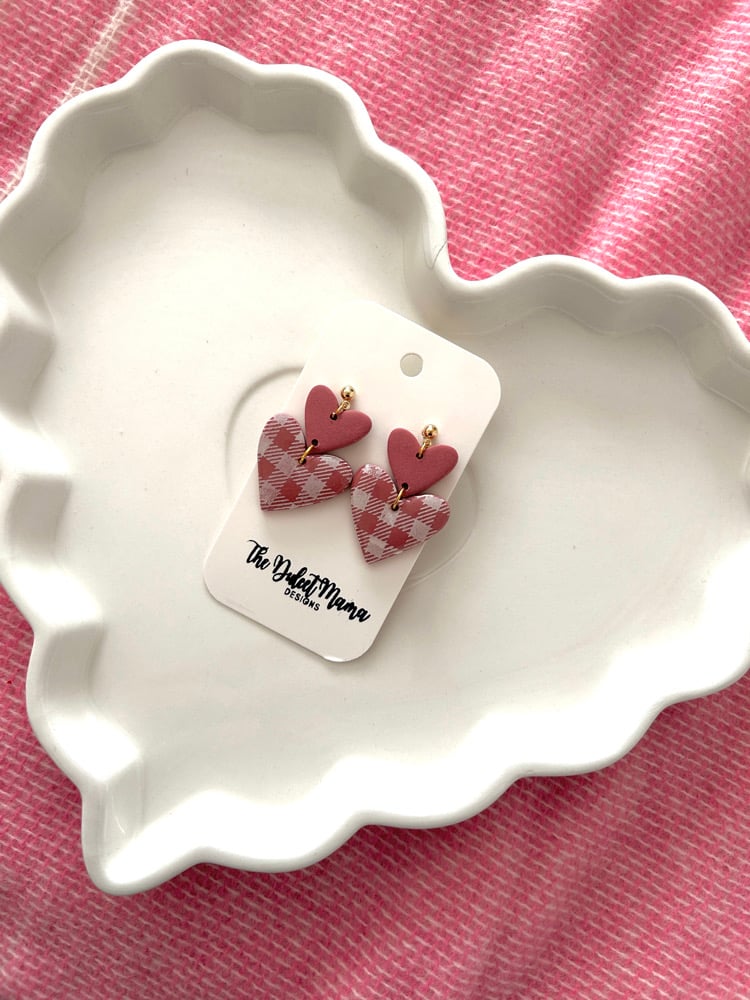 The Serena earrings feature two hearts, one pink and one white plaid, with a glossy resin coat on the plaid heart. Lightweight and hypoallergenic for everyday comfort.